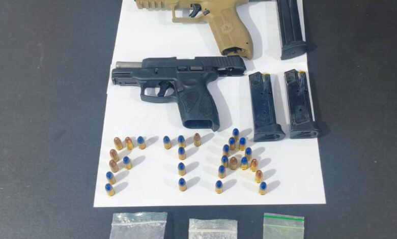 Durante a abordagem, foi constatado que dois suspeitos portavam cada um, uma pistola calibre 9mm de uso restrito.