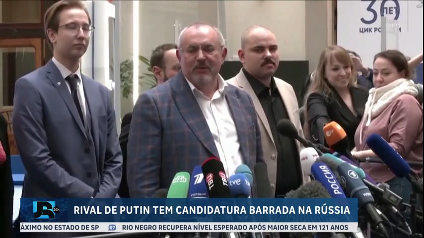 Notícias JR 24H Boletim JR 24H Na Rússia, os candidatos precisam coletar ao menos 100 mil assinaturas para poder validar uma candidatura Boletim JR 24H 08/02/2024 – 12h15 Para ver este vídeo, ative o JavaScript e considere atualizar para um navegador da Web que suporta vídeo HTML5 O único opositor de Vladimir Putin, que manifestou desejo de disputar as eleições presidenciais na Rússia, teve a candidatura barrada. A Comissão Eleitoral Central vetou a participação de Boris Nadezhdin alegando ter encontrado assinaturas falsas em um documento apresentado por ele. Veja também Boletim JR 24H Vulcão entra em erupção pela terceira vez em dois meses na Islândia Boletim JR 24H IPCA fica em 0,42% em janeiro, segundo IBGE Boletim JR 24H Assista à íntegra da 1ª edição do JR 24 Horas desta quarta-feira (7) boletim jr 24 horas boris nadezhdin vladimir putin Últimas Carregando…