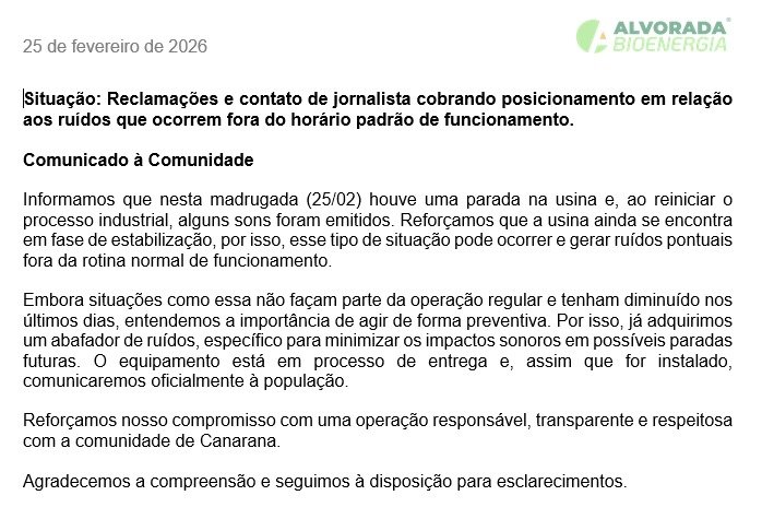 Procurada pela reportagem, a Alvorada Bioenergia encaminhou a seguinte nota: