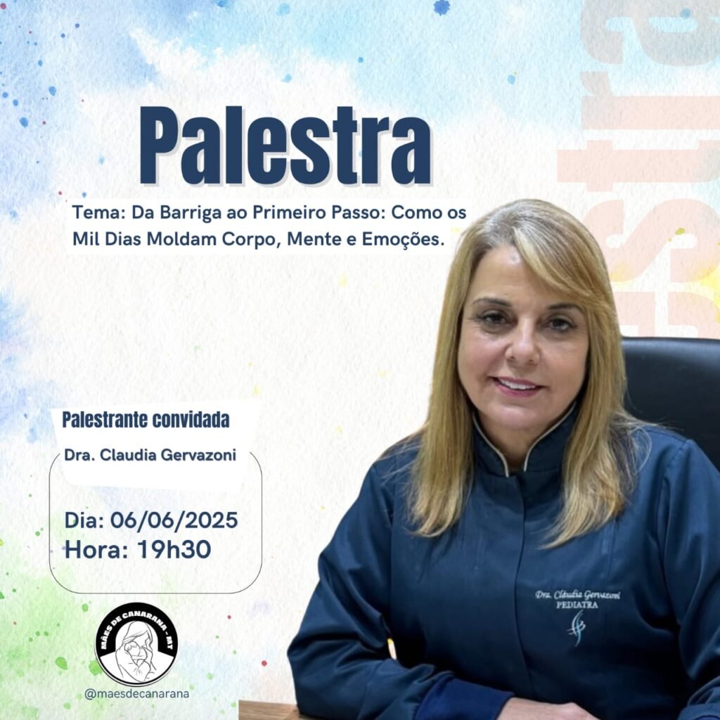 A palestra “Da Barriga ao Primeiro Passo: Como os Mil Dias Moldam Corpo, Mente e Emoções” será ministrada pela Dra. Cláudia Gervazoni, especialista na área, que trará informações valiosas sobre o impacto dessa fase no desenvolvimento físico, mental e emocional da criança.