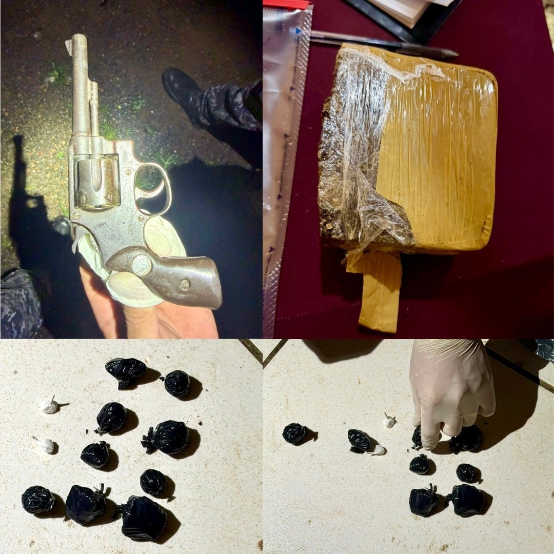 Durante a perícia no imóvel, foram apreendidos uma arma de fogo, um tablete e nove porções de substância semelhante à maconha, duas porções de substância análoga à cocaína (lacre nº 08018671) e um aparelho celular danificado.