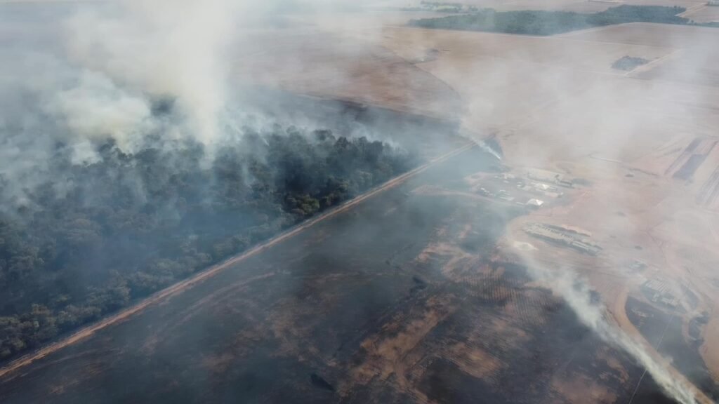 QUERÊNCIA – Um foco de incêndio na mata ao lado do canteiro de obras da FS Bioenergia, em Querência, se alastrou e atingiu parte da estrutura na tarde desta quinta-feira, 21 de agosto de 2025, por volta das 14h. Caminhões-pipa foram acionados e conseguiram conter as chamas no local.