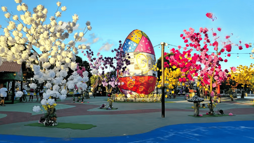 O gigantesco ovo é revestido por tecido sublimado com imagens que homenageiam a cidade, e é iluminado por luzes de LED reaproveitadas da decoração natalina de 2024. À noite, a estrutura se destaca ainda mais, cercada por flores artesanais, esculturas de animais feitos em fibra de vidro e elementos cenográficos produzidos à mão, como cogumelos, borboletas e joaninhas.